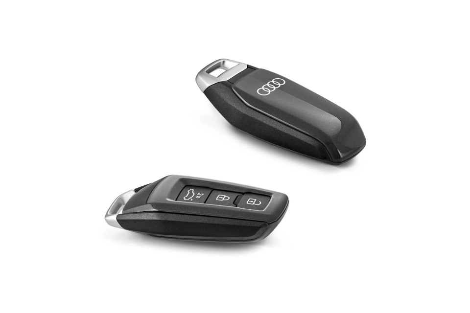 De hoogwaardige sleutelhoes in grijs met Audi-ringen biedt een exclusieve en stijlvolle personalisatie van uw autosleutel. De decoratieve hoes wordt met een aan de binnenzijde aangebrachte kleeffolie stevig op de originele sleutel bevestigd.