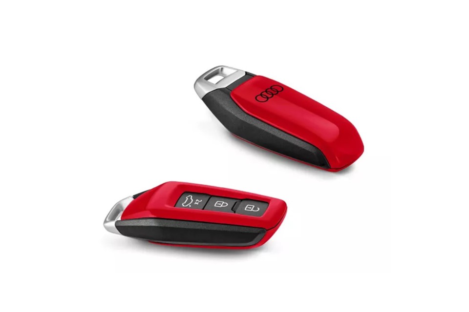 De hoogwaardige sleutelhoes in rood met Audi-ringen biedt een exclusieve en stijlvolle personalisatie van uw autosleutel. De decoratieve hoes wordt met een aan de binnenzijde aangebrachte kleeffolie stevig op de originele sleutel bevestigd.