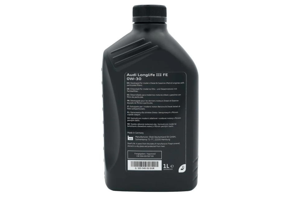 Originele Audi Longlife 3 (0W30) motorolie. Deze volledig synthetische olie is 100% origineel Audi en ontwikkeld voor moderne benzine- en dieselmotoren met roetfilters. De formulering voldoet aan de officiële Volkswagen-goedkeuringsnormen en is achterwaarts compatibel met Longlife III 5W30. Hierdoor is het de directe opvolger van GAU052195M2.