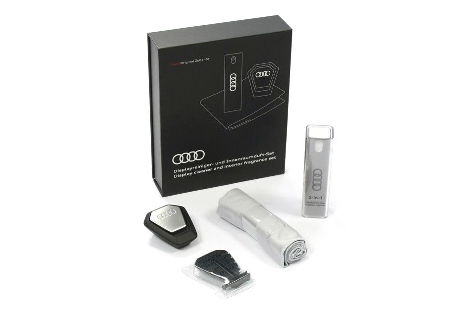 De originele Audi displayreiniger en interieurgeurset is ontwikkeld voor bestuurders die hun interieur in topconditie willen houden. Deze complete set combineert effectieve reiniging van touchscreens en displays met een subtiele, stijlvolle geurbeleving via de Audi Singleframe geurdispenser. De displayreiniger en het speciale doekje verwijderen vingerafdrukken en vuil zonder strepen achter te laten. De zwarte Audi Singleframe geurdispenser sluit perfect aan bij het interieur en zorgt voor een frisse uitstraling met een herkenbare Audi-kwaliteit.