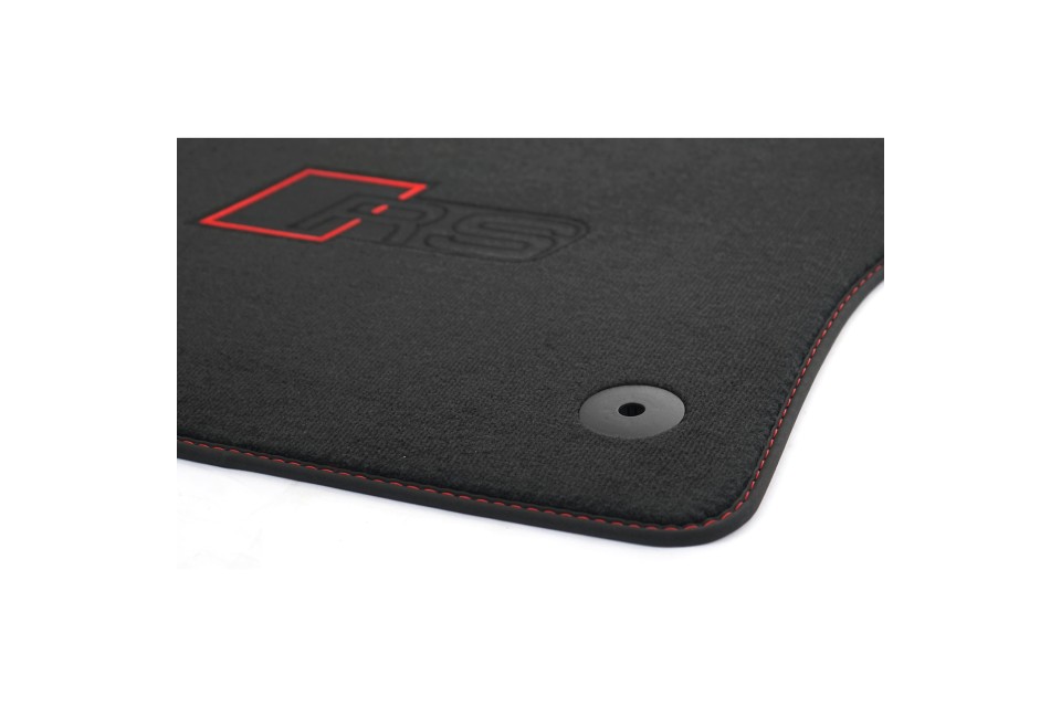 Originele Audi RS3 textiel vloermatten voor de voor- en achtervoetruimte, geleverd als complete 4-delige set. Deze hoogwaardige vloermatten bieden een perfecte pasvorm en zijn vervaardigd volgens de kwaliteitsnormen van Audi. De matten hebben een sportieve uitstraling dankzij het zwarte en rode design met contrasterende rode stiksels en het RS-logo op de voorste matten. Voorzien van een praktisch drukknoop-bevestigingssysteem voor een veilige bevestiging.