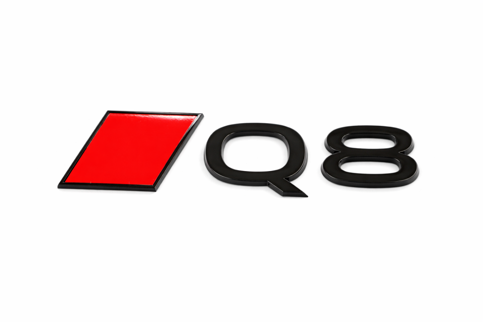 Origineel Audi Q8 embleem voor achterop met ruit, uitgevoerd in de stijlvolle black edition. Dit logo heeft een moderne, tweedimensionale uitstraling en is volledig conform de originele Audi-specificaties.