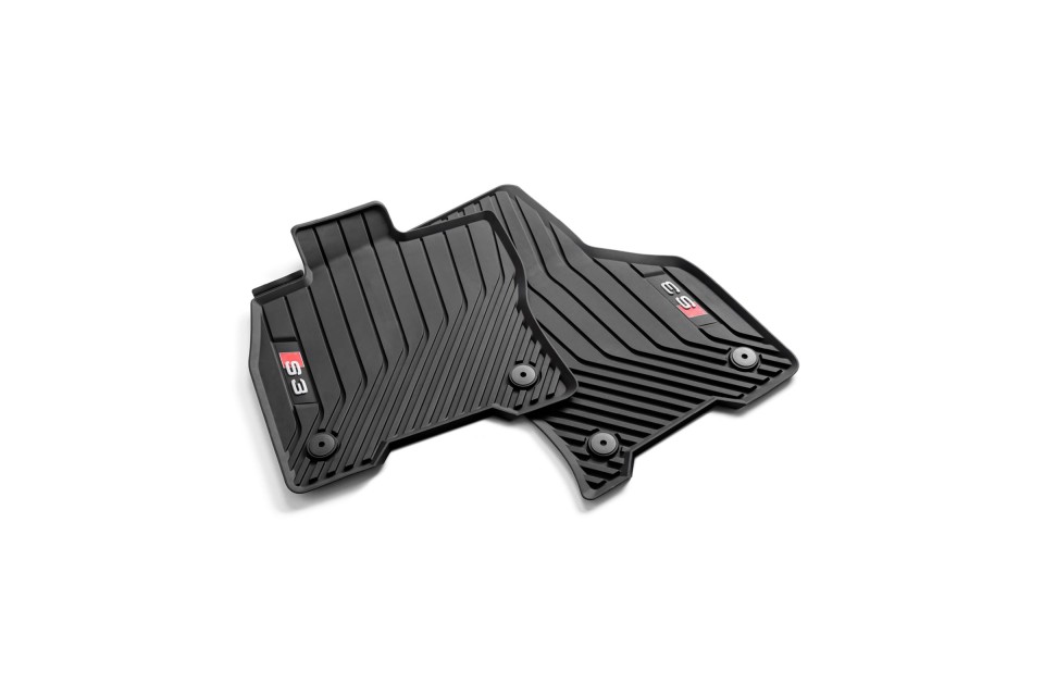 Originele Audi all-weather vloermatten voor de voorste voetruimte, ontwikkeld voor een perfecte pasvorm en optimale bescherming van het interieur van uw Audi A3. Deze duurzame rubbermatten zijn exact afgestemd op de vloerafmetingen van het specifieke model en voorzien van een modelgebonden opschrift in contrasterende kleur. Dankzij de antislipnoppen aan de achterzijde en het praktische drukknoop-bevestigingssysteem blijven de matten stevig op hun plaats liggen.