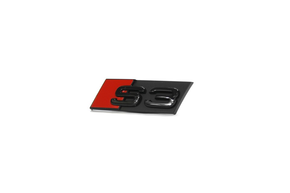 Originele Audi S3-belettering voor de grille van de Black Edition. Deze exclusieve belettering in glanzend zwart met rood accent geeft de voorzijde van uw Audi een sportieve en hoogwaardige uitstraling.