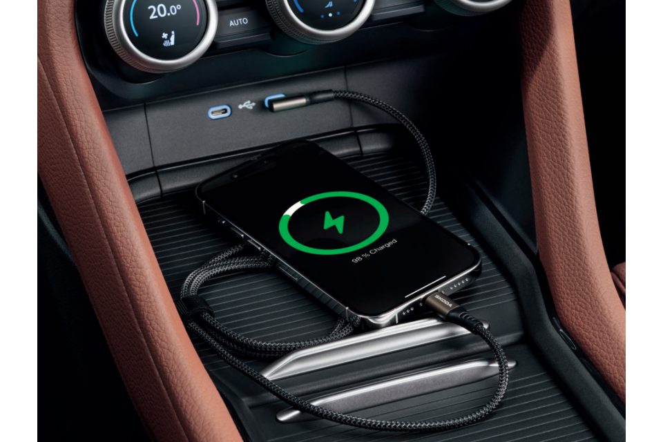 - Originele Škoda laad- en datakabel, USB-C naar Apple Lightning