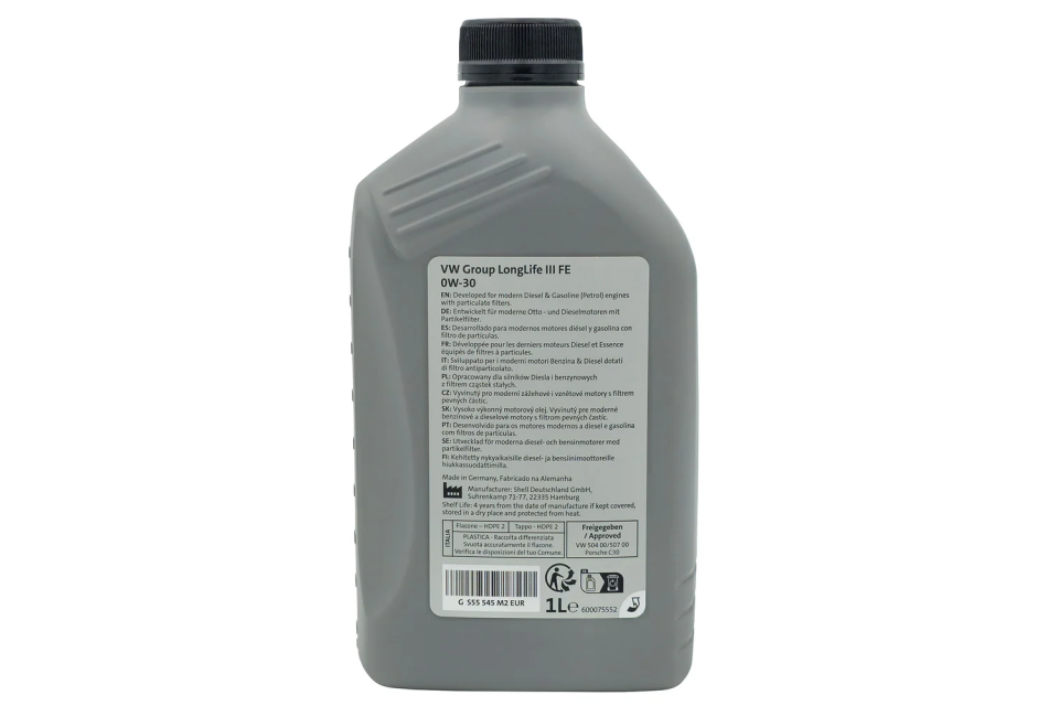 Originele Volkswagen, Audi, SEAT en Skoda motorolie Longlife 3 (0W30). Deze olie is 100% origineel en voldoet aan de officiële Volkswagen-goedkeuringsnormen. Geschikt voor moderne benzine- en dieselmotoren met roetfilters en perfect afgestemd op voertuigen met Longlife Service.